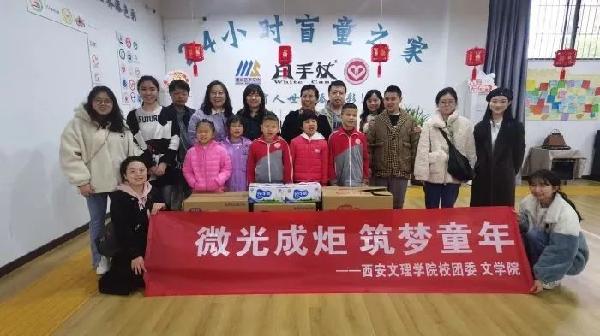 为加快推进前期与西安市青年志愿者行动指导中心合作的“24小时盲童之家”社会实践项目。3月23日下午,校团委副书记钱尹璐、文学院党总支副书记李莎莎、辅导员赵鑫、文学院学生干部、校青年志愿者协会负责人一行12人来到“24小时盲童之家”,同西安市青年志愿者行动指导中心干部高莉、赵宇,陕西白手杖视障服务中心理事长惠娜洽谈推进志愿服务项目并看望慰问视障儿童。